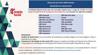 O Instituto Avante Social está com inscrições abertas para o cargo de Auxiliar de Saúde Bucal e Assistente de Tecnologia da Informação (TI), com atuação nas unidades presente na imagem.