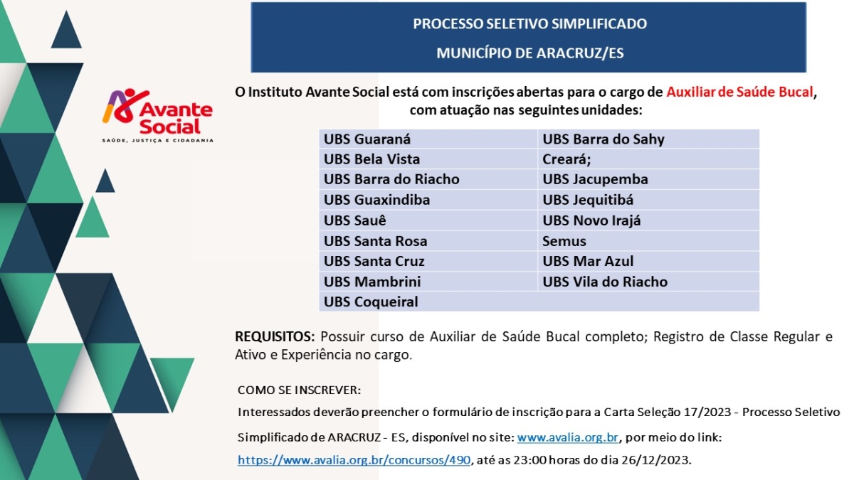O Instituto Avante Social está com inscrições abertas para o cargo de Auxiliar de Saúde Bucal. (MAIS INFORMAÇÕES NA IMAGEM ABAIXO)