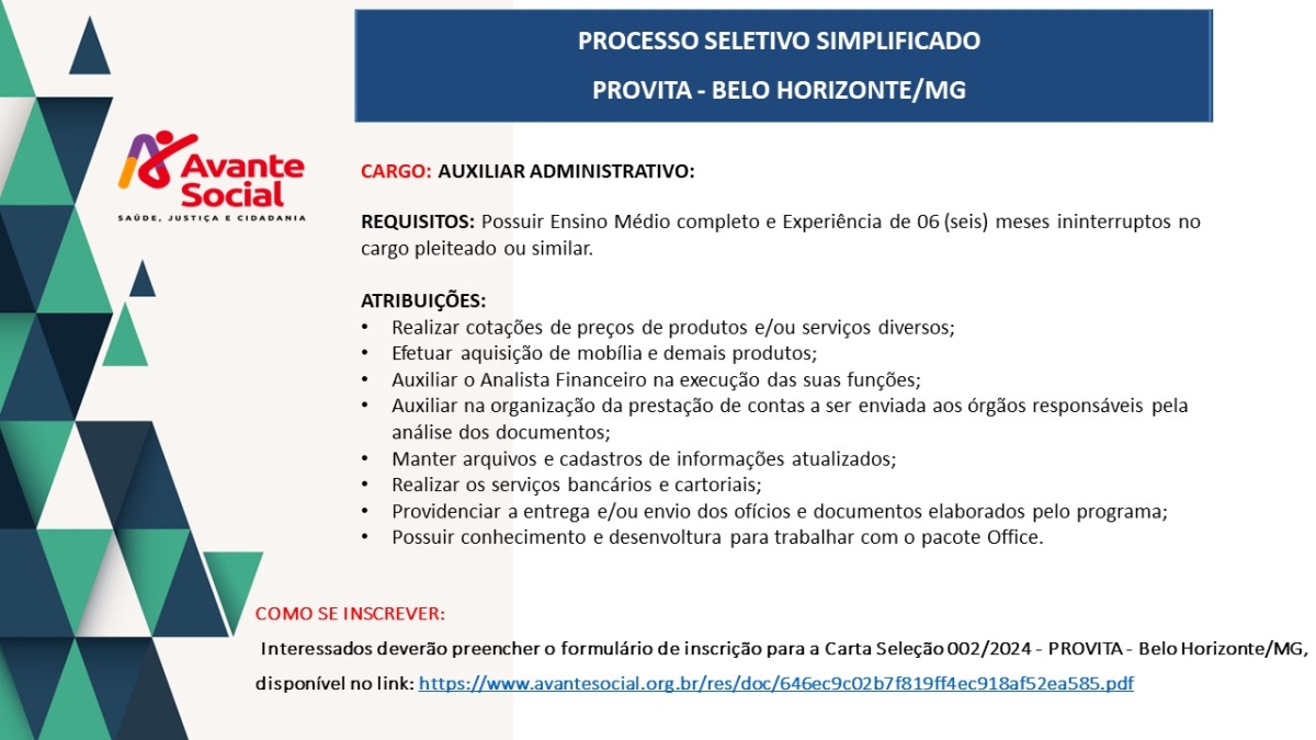COMO SE INSCREVER:Interessados deverão preencher o formulário de inscrição para a Carta Seleção 002/2024 - PROVITA - Belo Horizonte/MG, disponível no link: https://www.avantesocial.org.br/res/doc/646ec9c02b7f819ff4ec918af52ea585.pdf